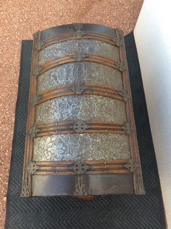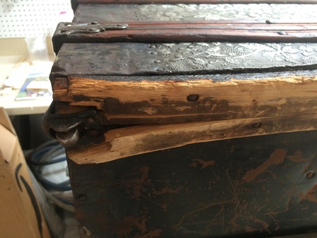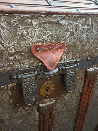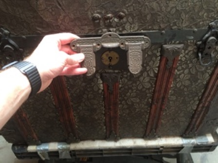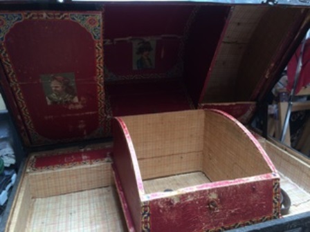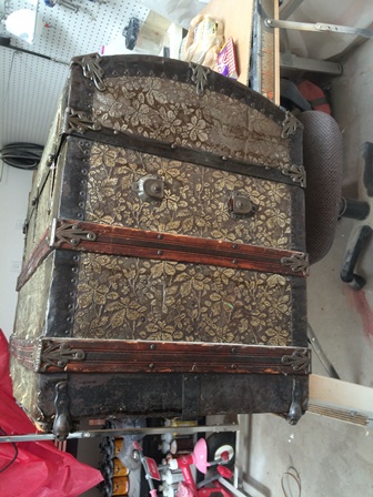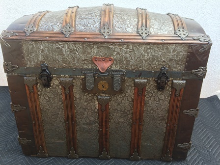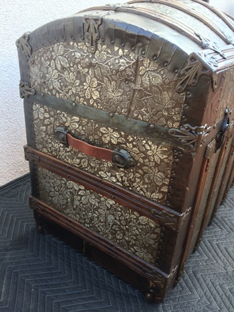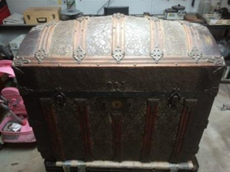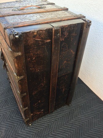 This has been the largest trunk restoration we have completed to date. Our customer wanted a restoration but also wanted us to retain the 100+ years of patina. We first set about hand cleaning the tin which had years of rust dirt and grim build up. We believe that the trunk also had fire damage which had caused a darkening of the wood and tin. We then set about remaking the broken base slider and then replacing a broken corner runner. The next replacement parts were the leather handles and lid tab. These were all hand made by our upholstery dept. The interior was upgraded from paper to cedar panels. Lastly we used a satin water based lacquer to seal and protect the exterior thus preserving the patina we had uncovered. See the results below and our customer review.