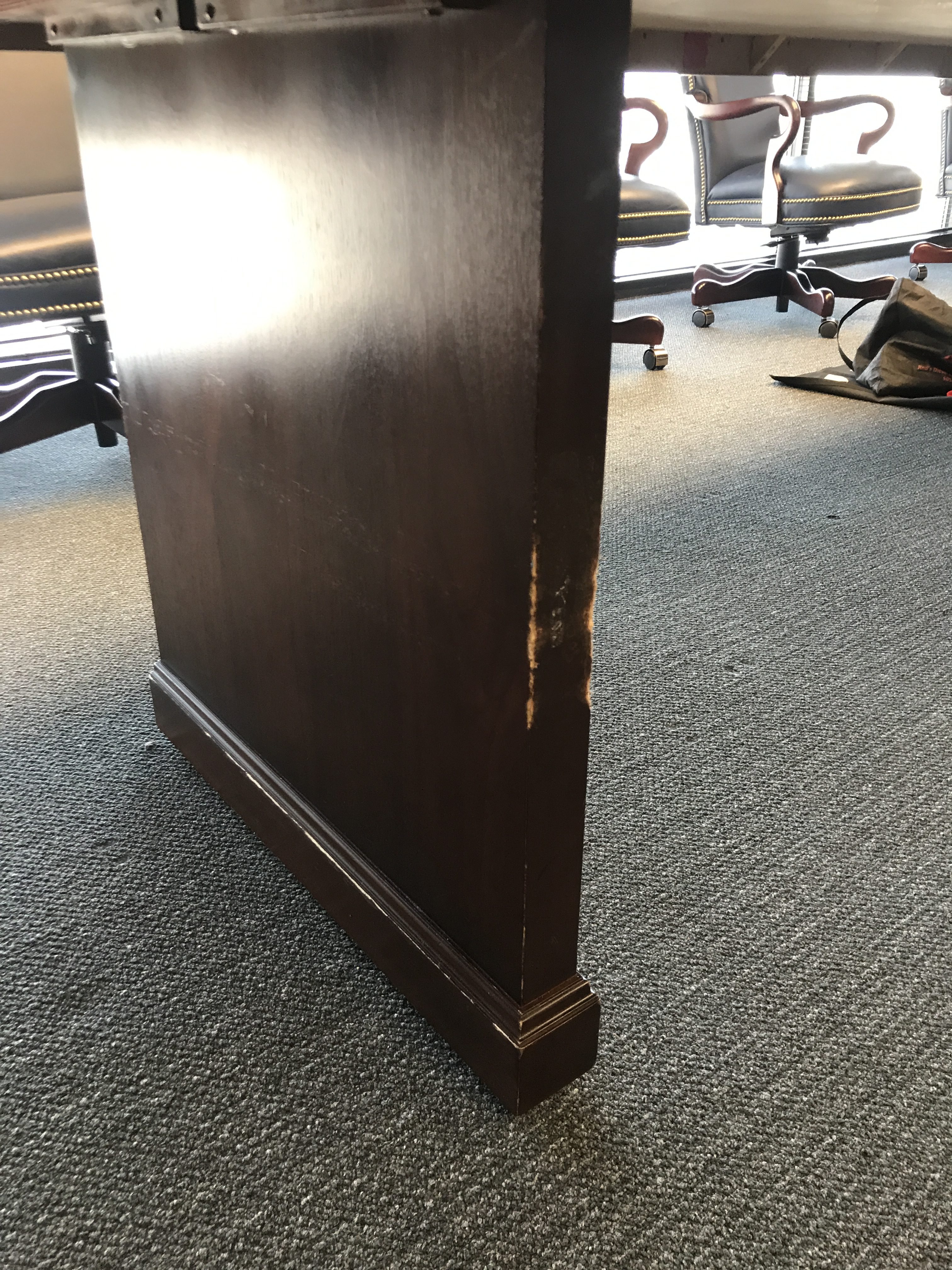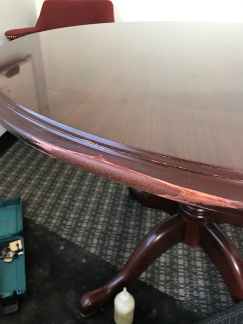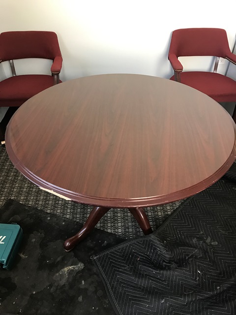 ALTHOUGH EVERY MORTISE AND TENON JOINT WAS LOOSE AND THE TOP HAD WARPED AND BUSTED AWAY FROM THE LEG BASE. WE WERE ABLE TO STABILIZE THE TABLE WITH SOME HIDDEN HARDWEAR, THEN THE WOOD WAS HAND SANDED, STAINED AND TOPCAOTED WITH A SATIN SHEEN.