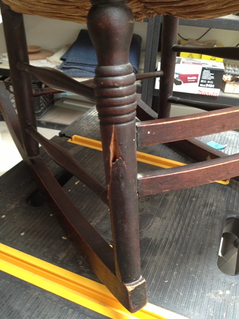 Mark repaired this rocking chair by stabilizing the broken rocking chair leg, fabricating several missing chair leg pieces, and finally by masking all signs of damage through precision wood repair. The chair is now weight bearing again and looks like new!