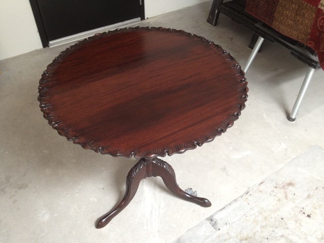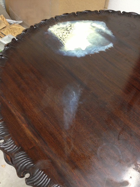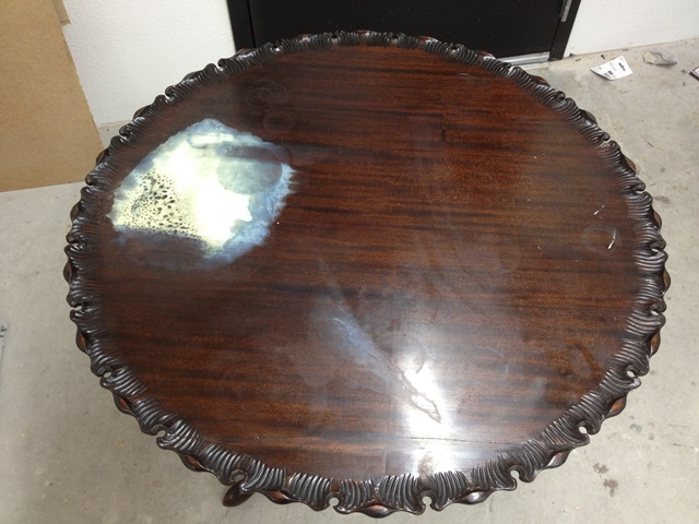 This lovely round ornate table had significant water damage that caused a large white blotchy area on a significantly large section of the table top. The customer was very fond of the table and wanted it restored to “like new” condition.