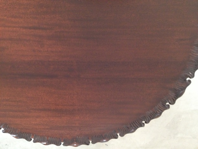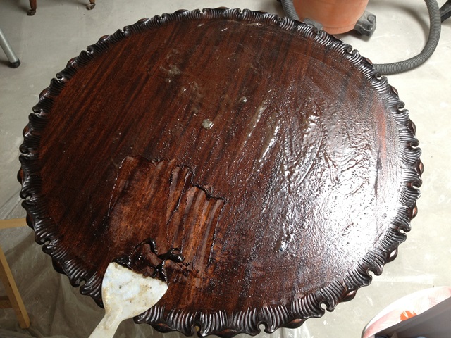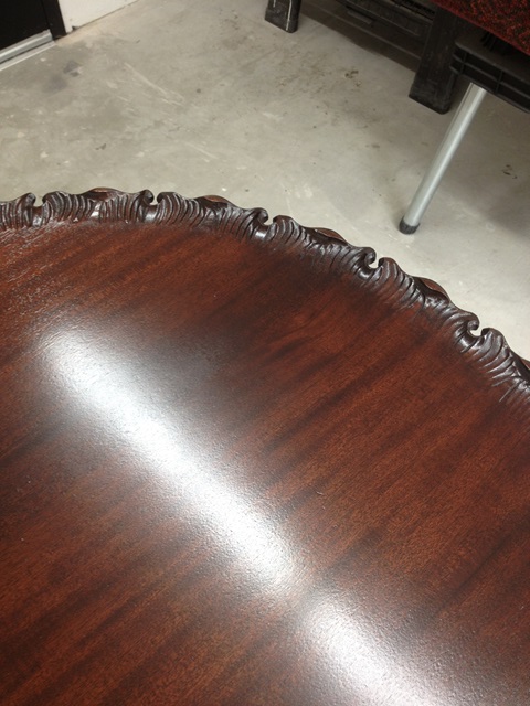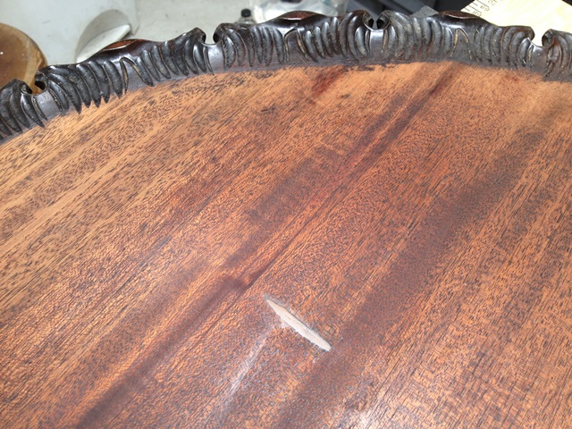 Mark was able to strip and refinish the table removing all of the moisture damage. This stripping was particularly difficult in the very detailed carved sections on the edge of the table where all build up needed to be removed. Mark had to clean out each small grove. There was also a 2 inch gouge that required a precision burn in repair. Finally the table was color-matched, re-stained and given multiple top coats of finish to help prevent future damage.