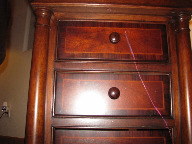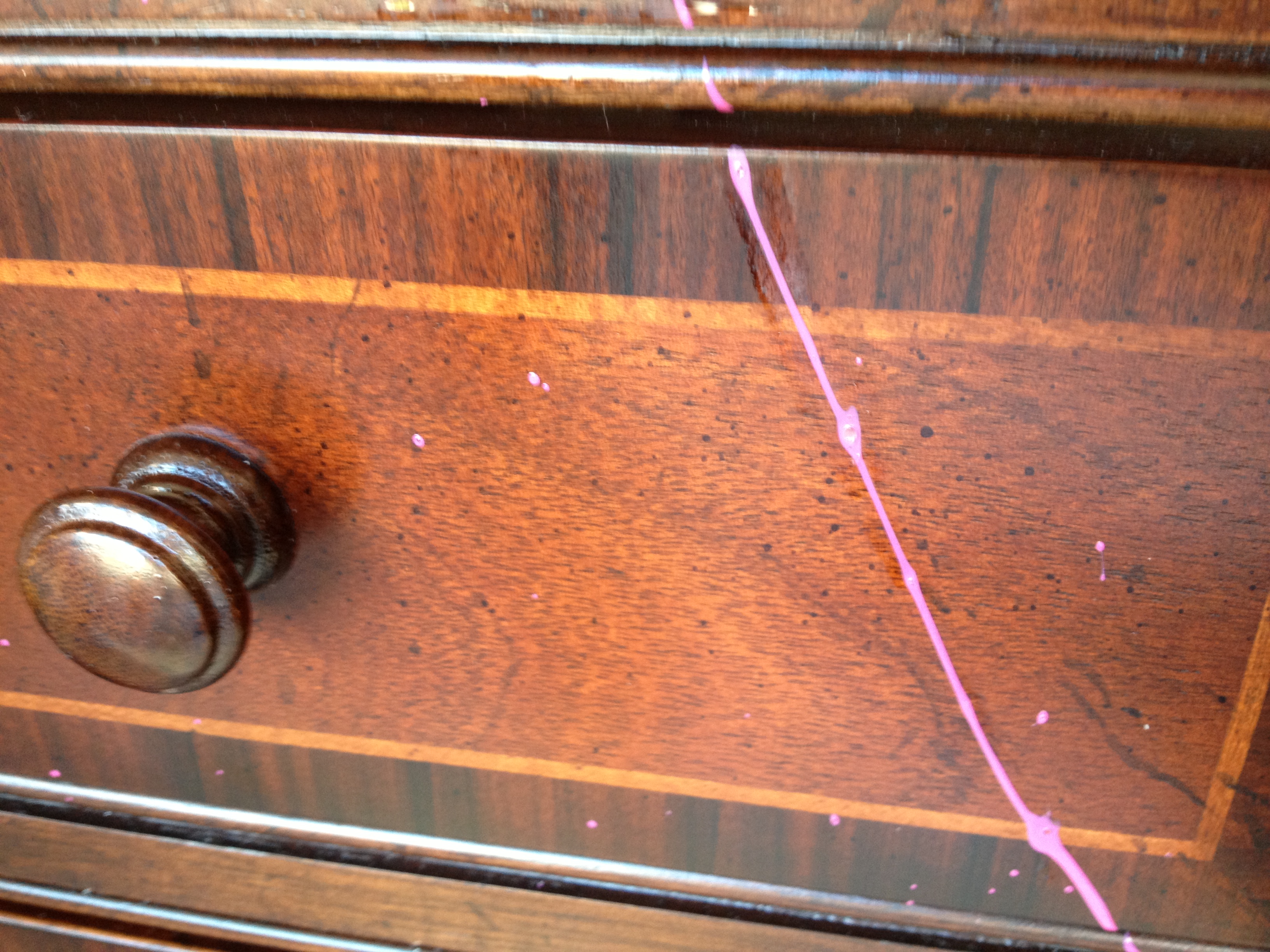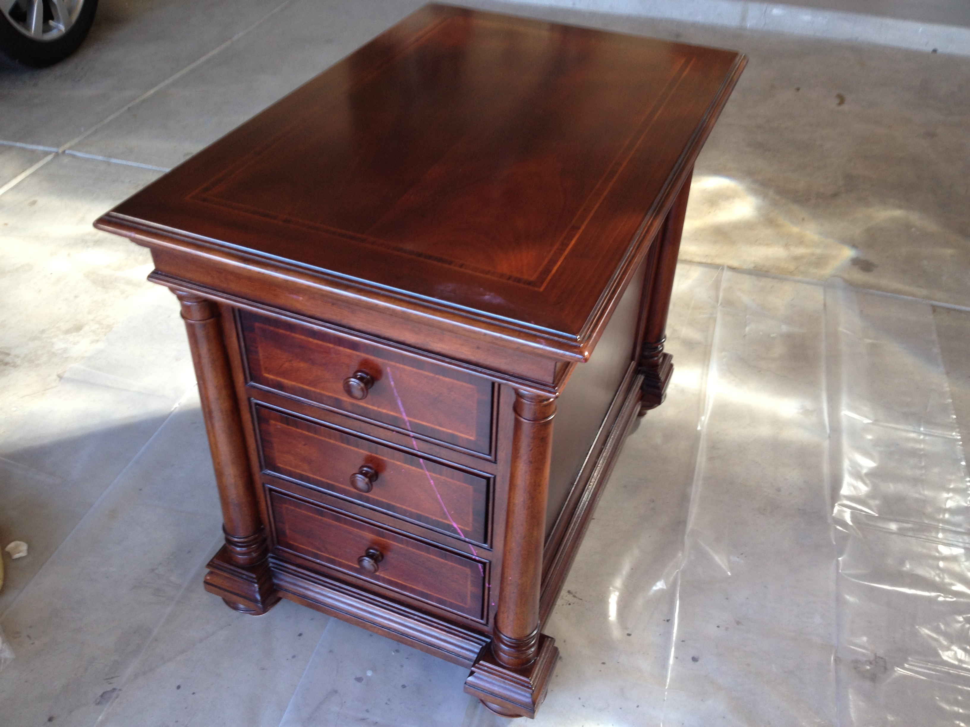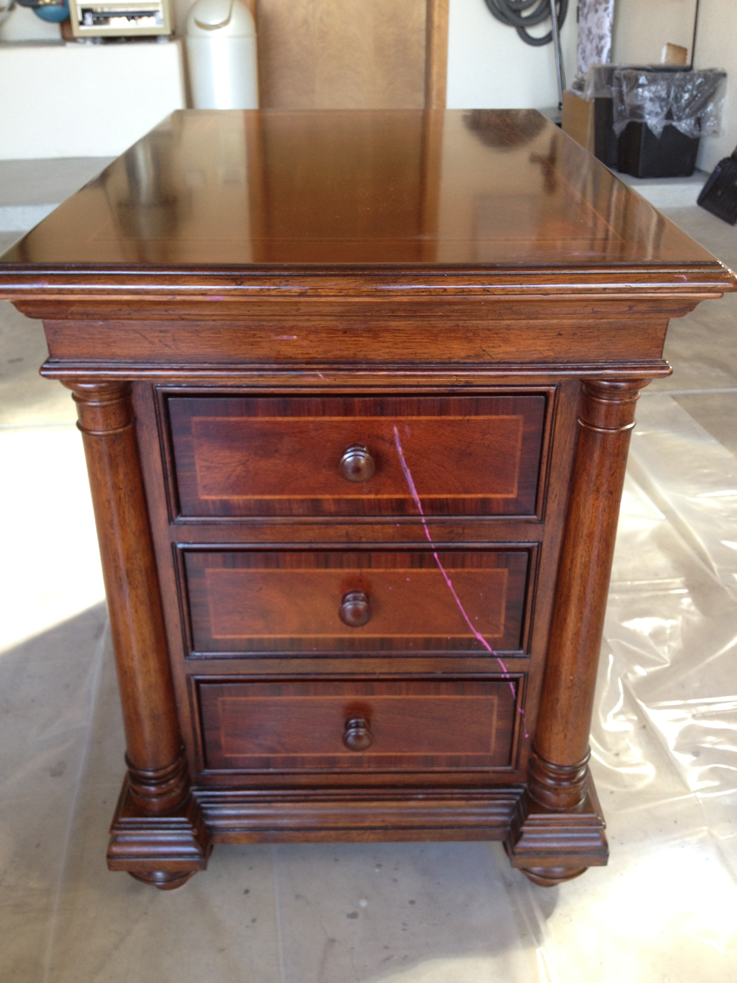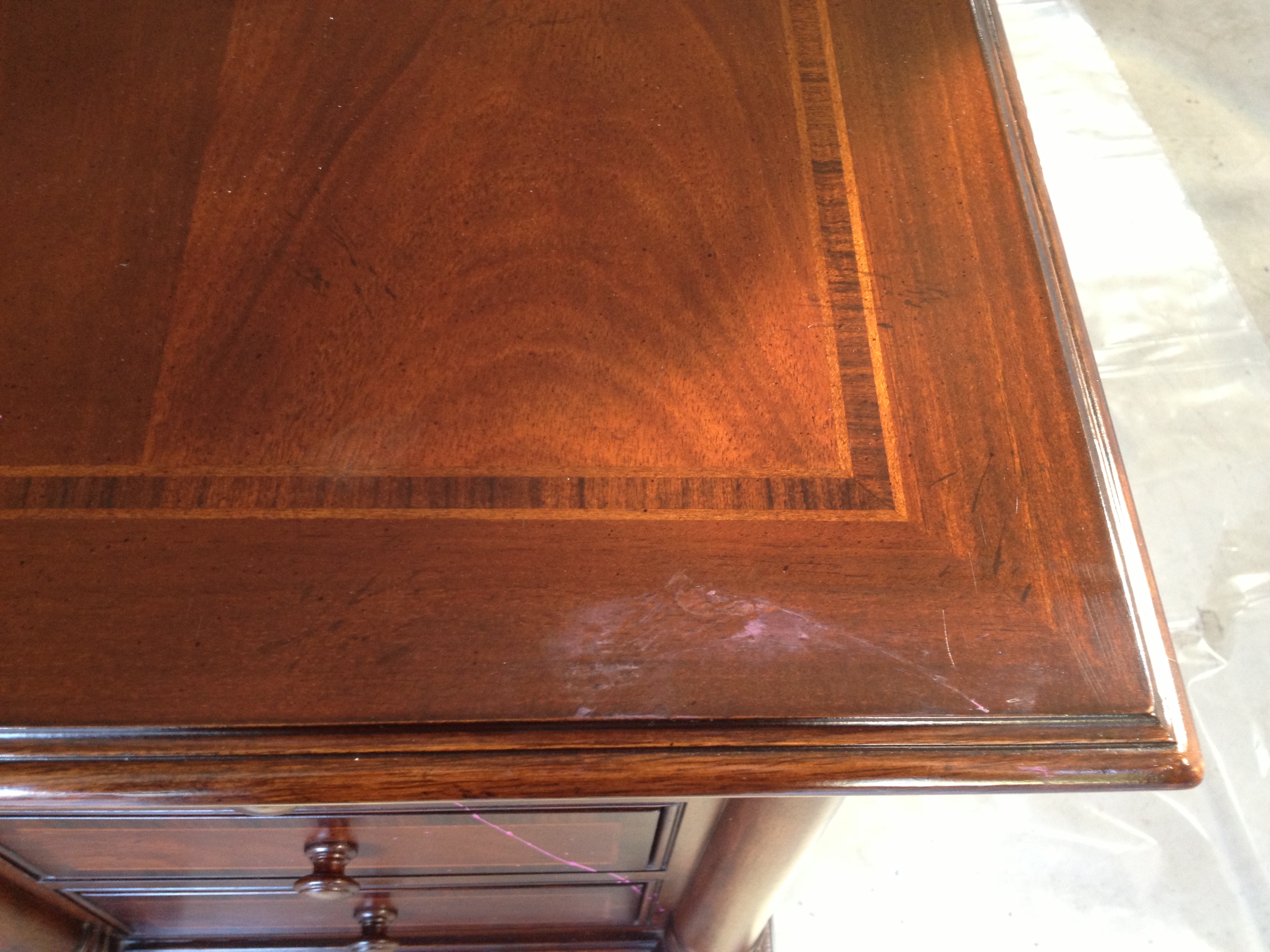 The second piece of damaged furniture was a 3 drawer side-table (part of a 7 piece living room set). Our customer had spilled hot-pink nail polish onto the top of the end table and also down the front of the 3 drawers. After spilling the nail polish our customer tried to remove the polish with nail polish remover, which unfortunately caused further damage to the end table. The nail polish ate through the finish down to the bare wood so a precision repair was not possible. A full strip and refinish of both the table top and the 3 drawers was required. The Gloss factory cured finish of the table made the return of the color and the glossy finish particularly lengthy and difficult process to return the polished / deluxe finish.