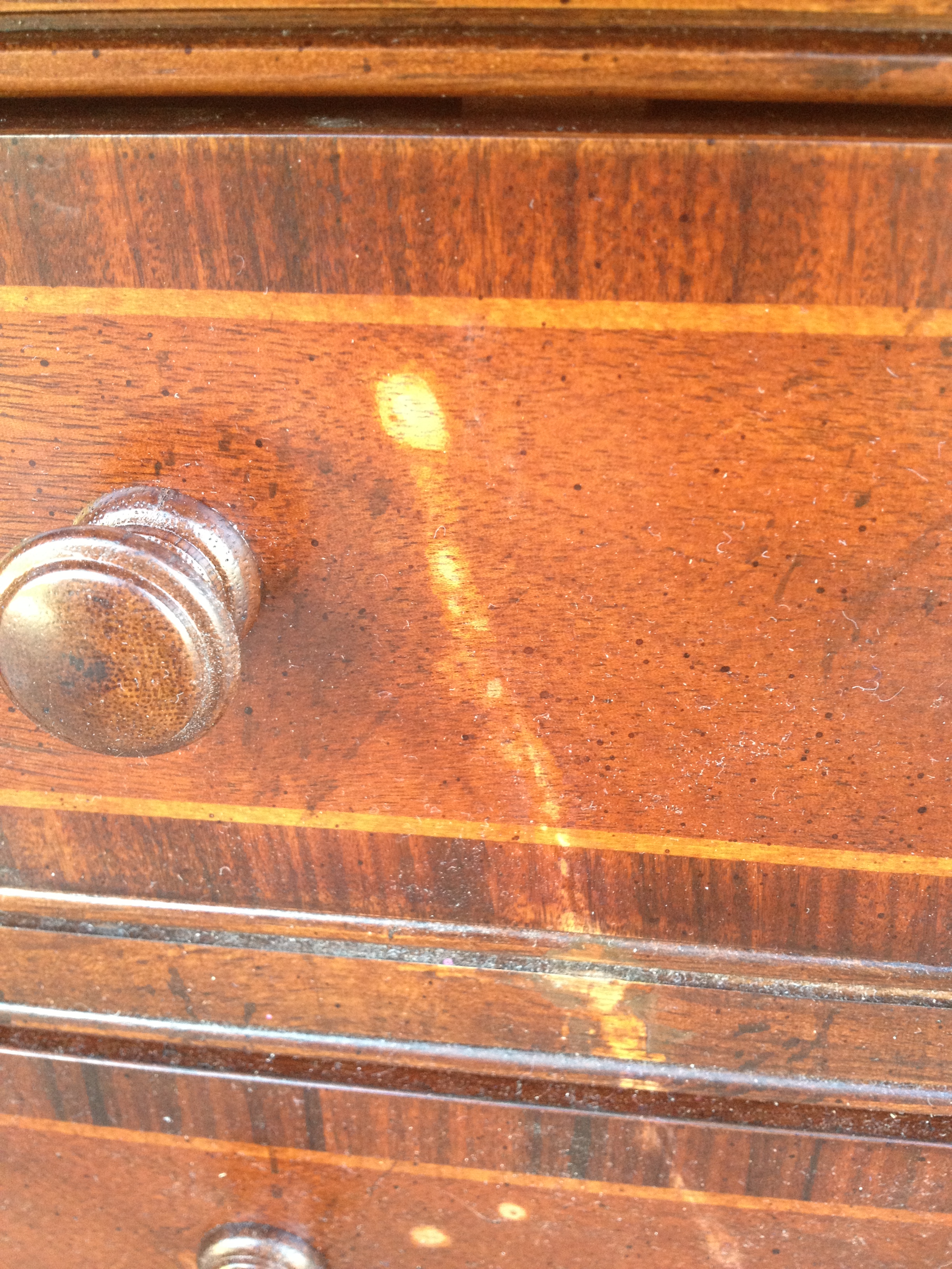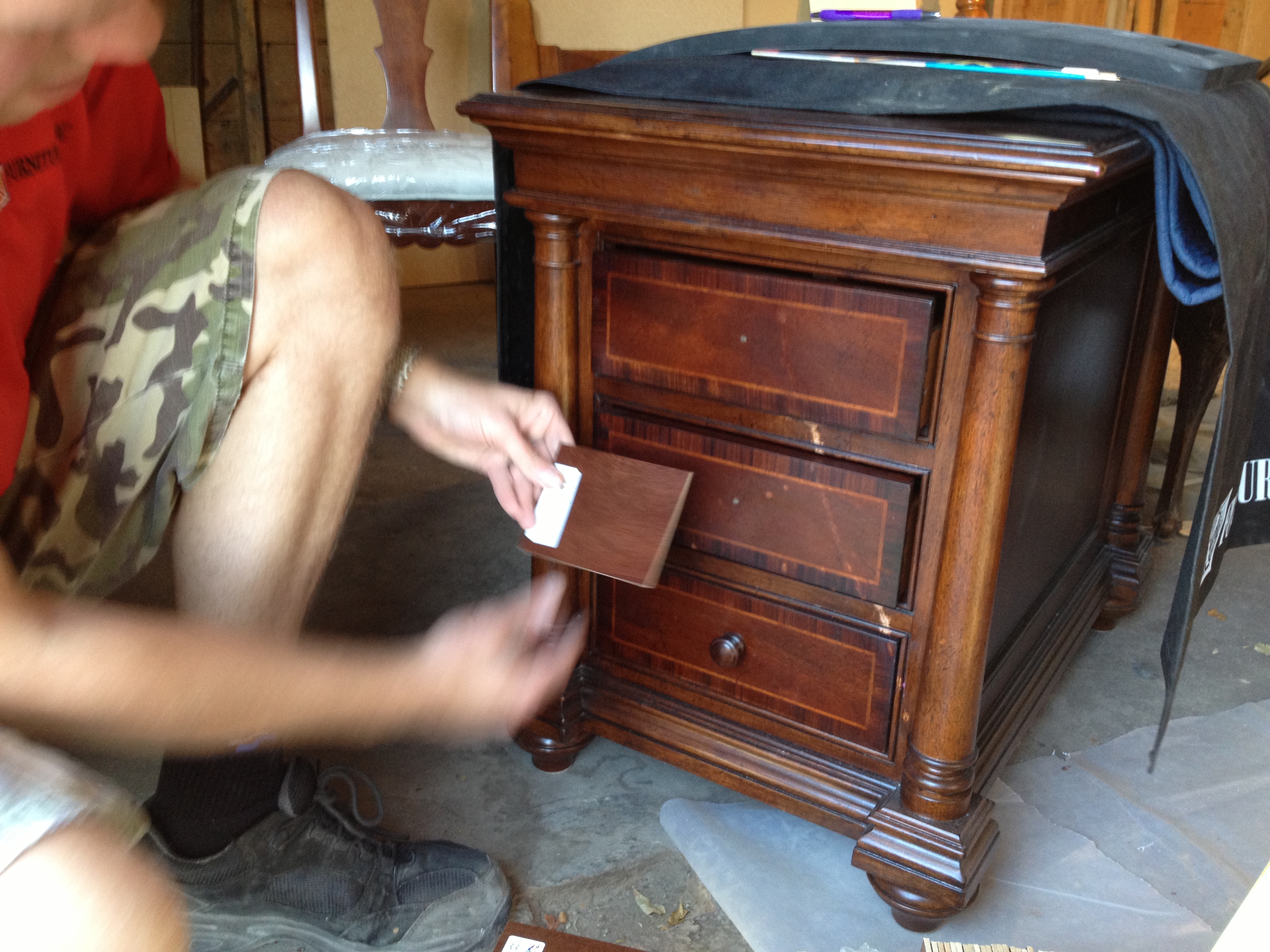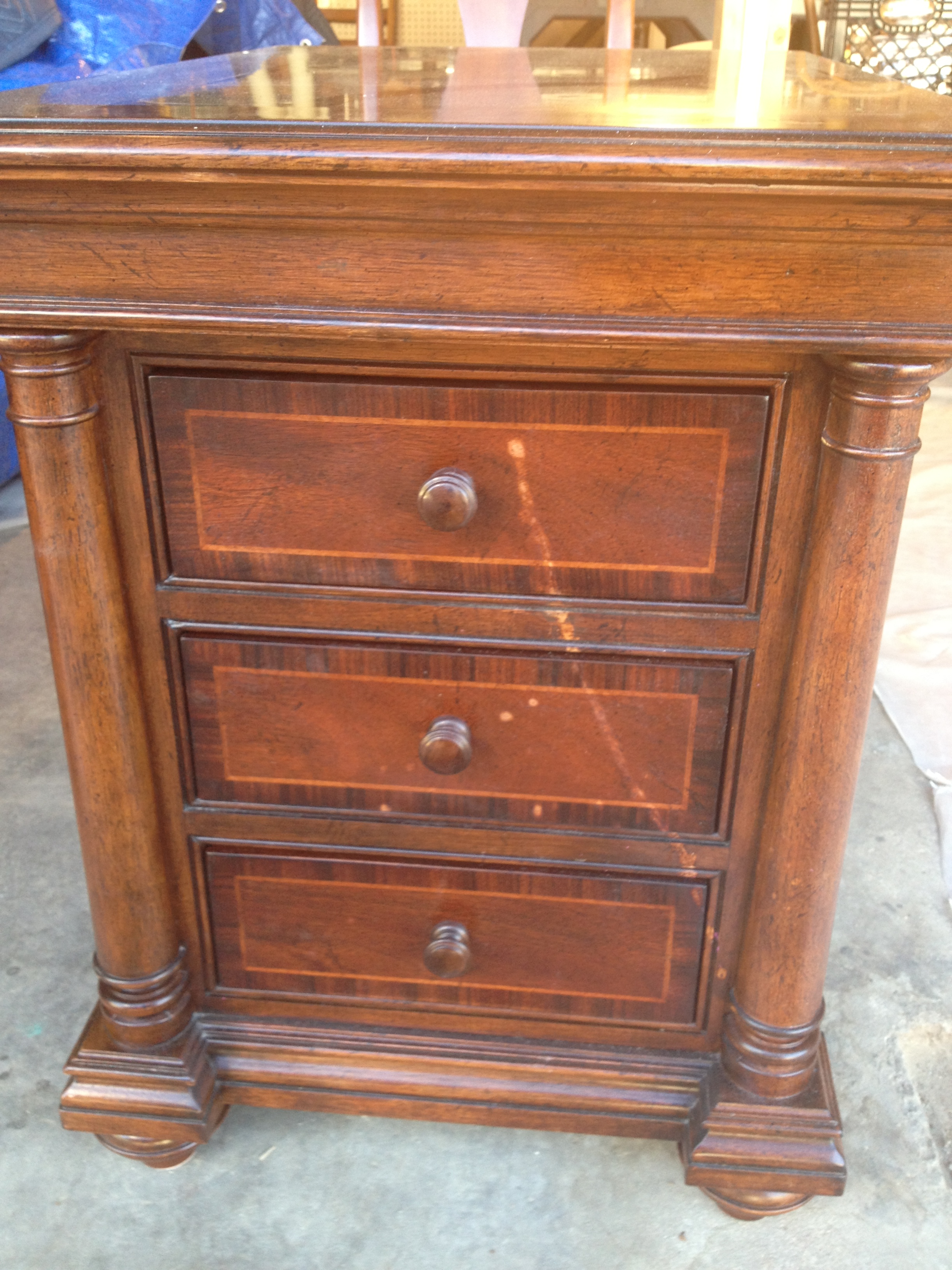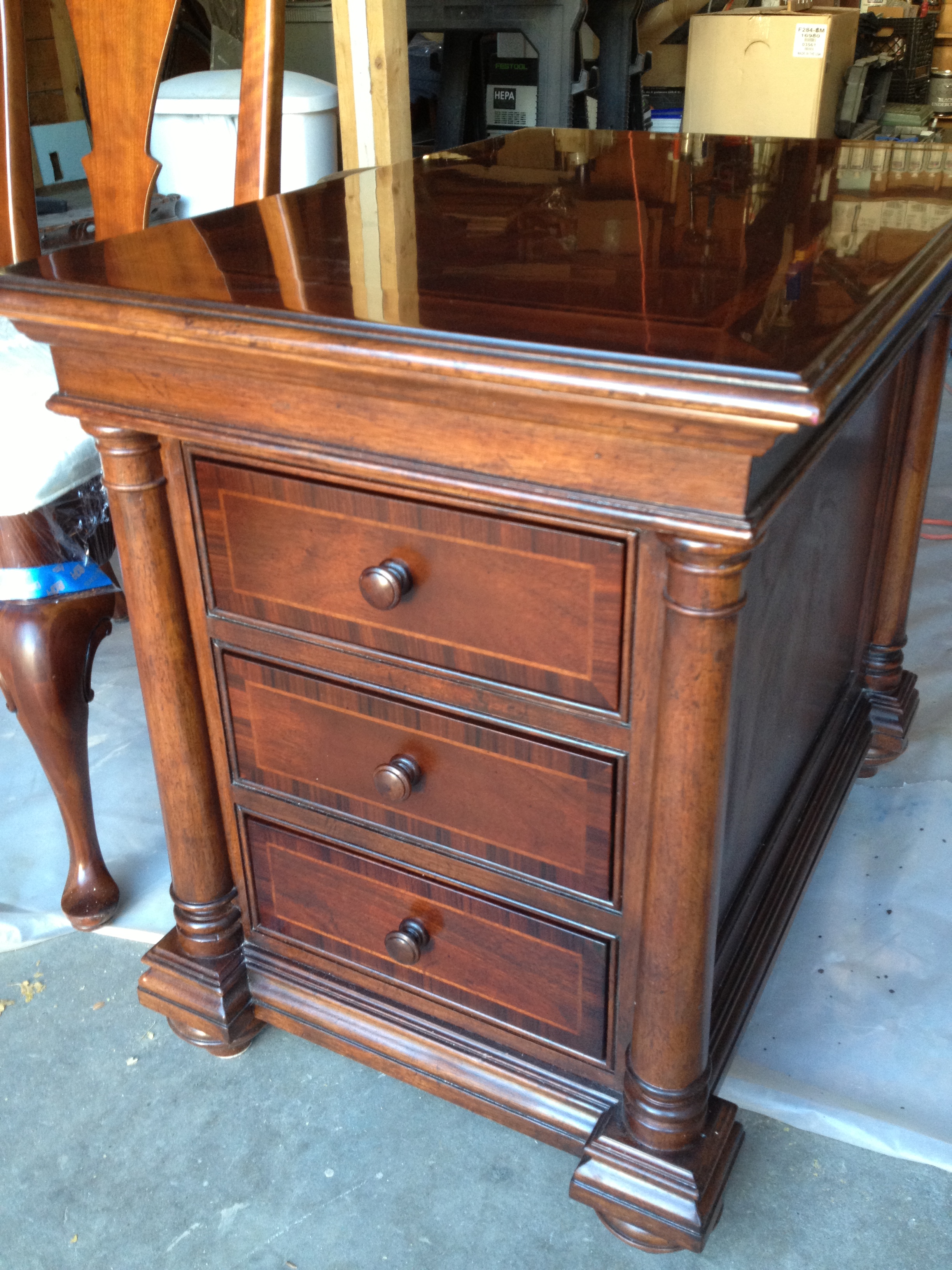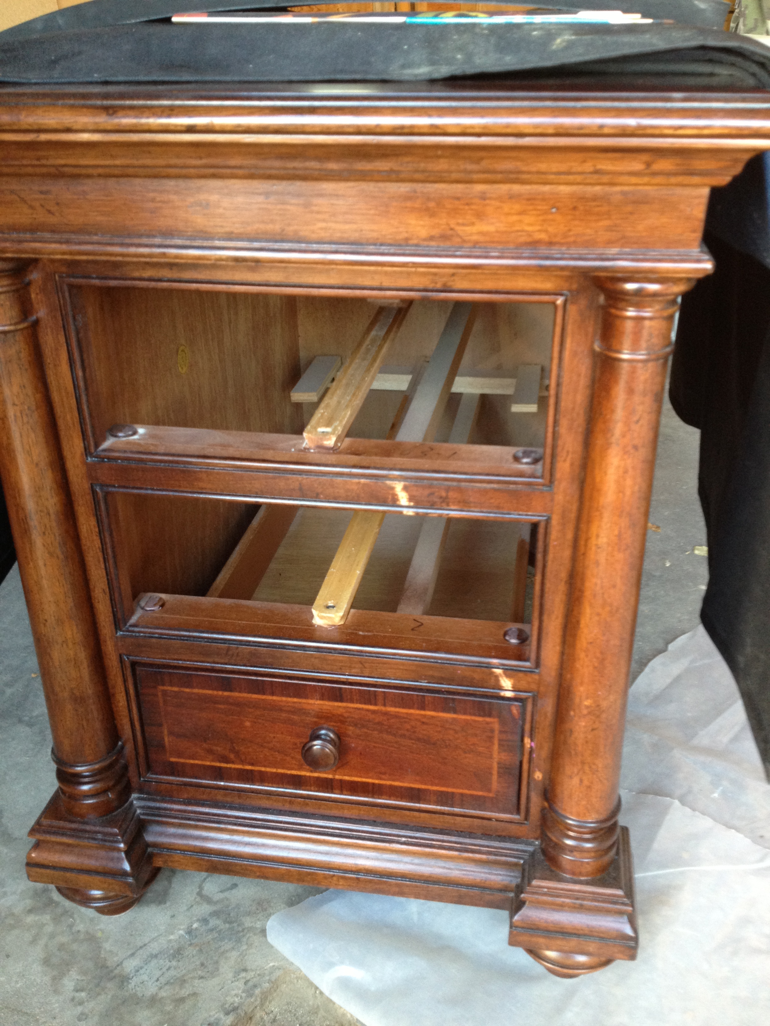 The second piece of damaged furniture was a 3 drawer side-table (part of a 7 piece living room set). Our customer had spilled hot-pink nail polish onto the top of the end table and also down the front of the 3 drawers. After spilling the nail polish our customer tried to remove the polish with nail polish remover, which unfortunately caused further damage to the end table. The nail polish ate through the finish down to the bare wood so a precision repair was not possible. A full strip and refinish of both the table top and the 3 drawers was required. The Gloss factory cured finish of the table made the return of the color and the glossy finish particularly lengthy and difficult process to return the polished / deluxe finish.