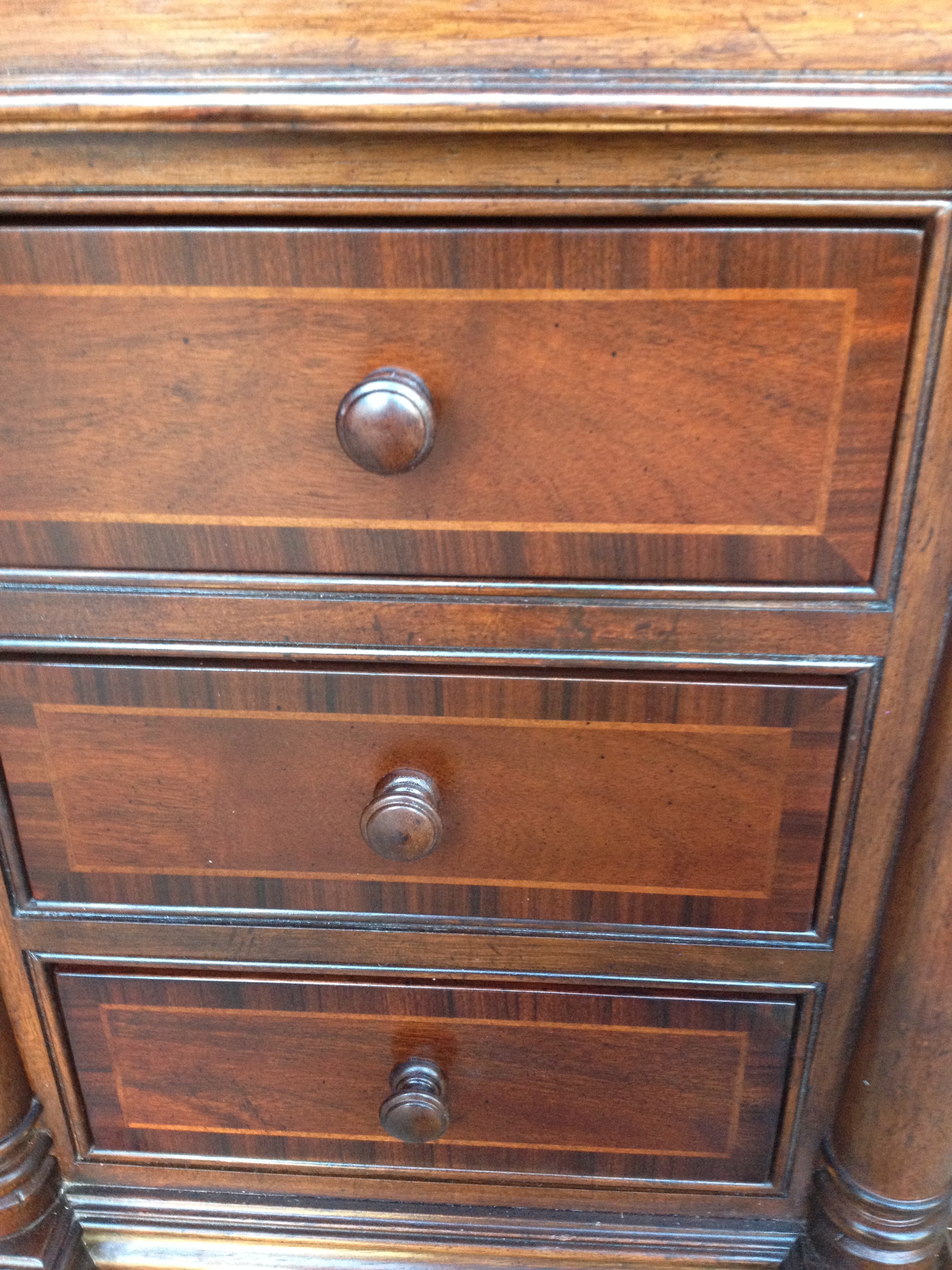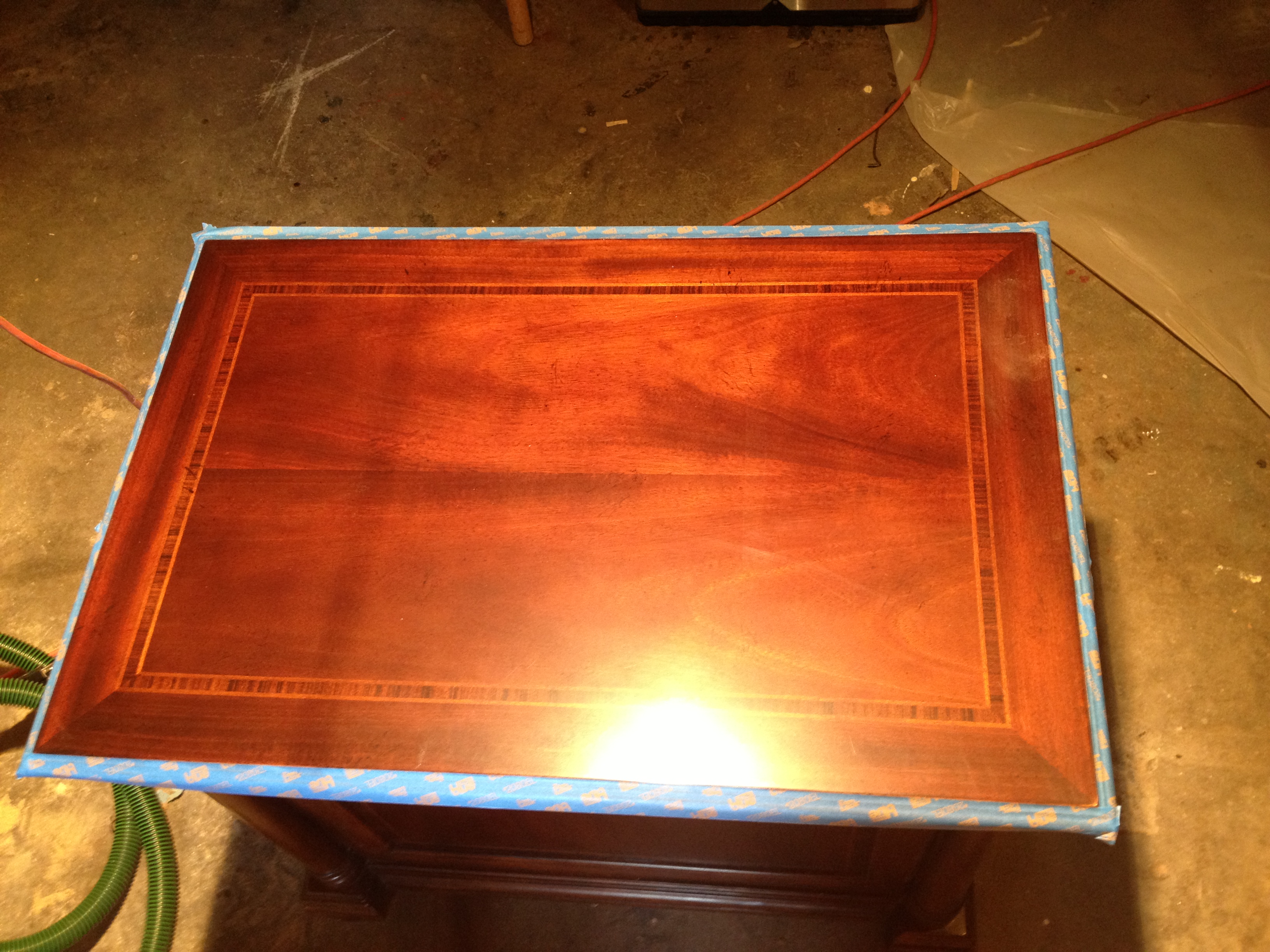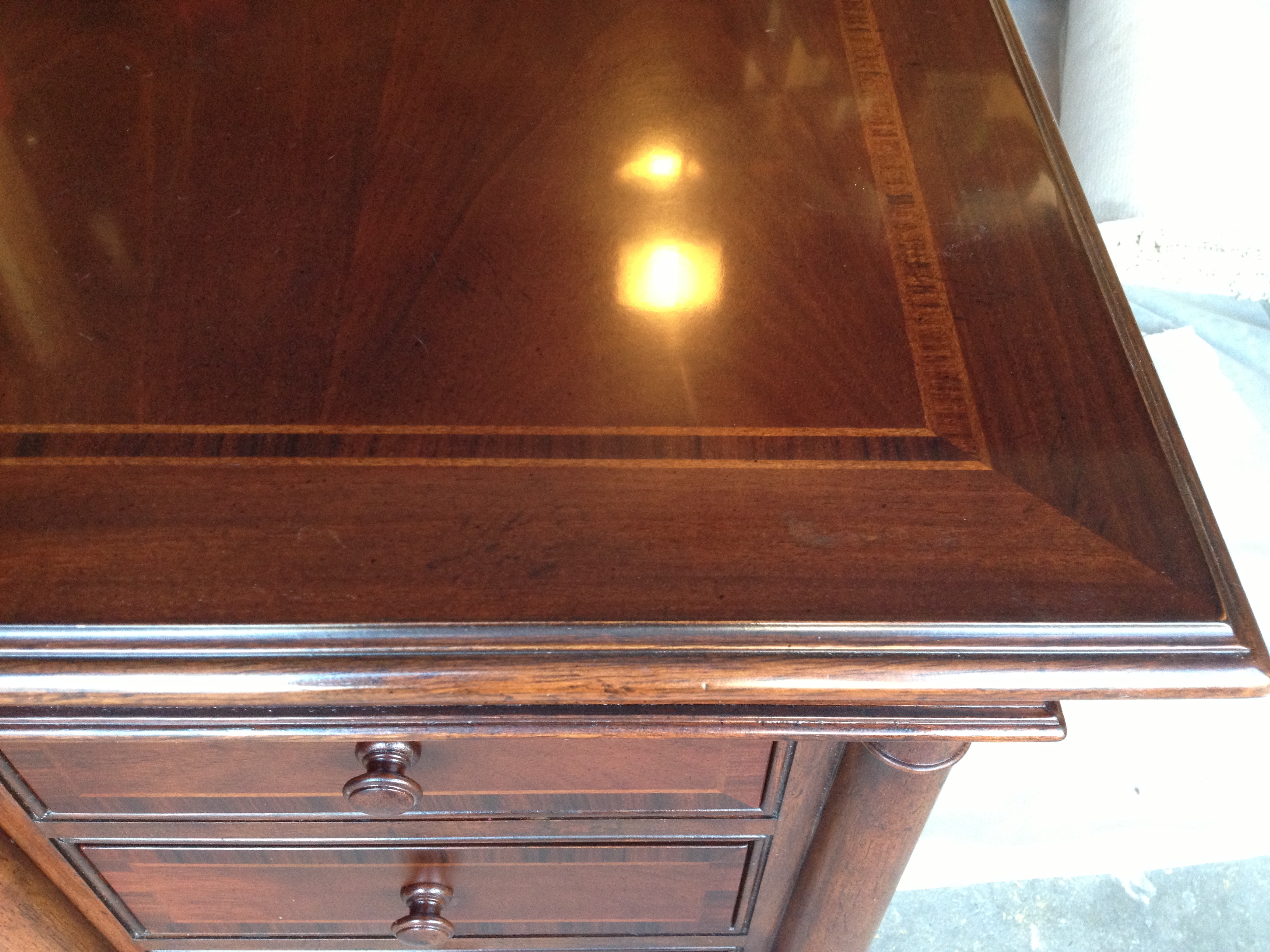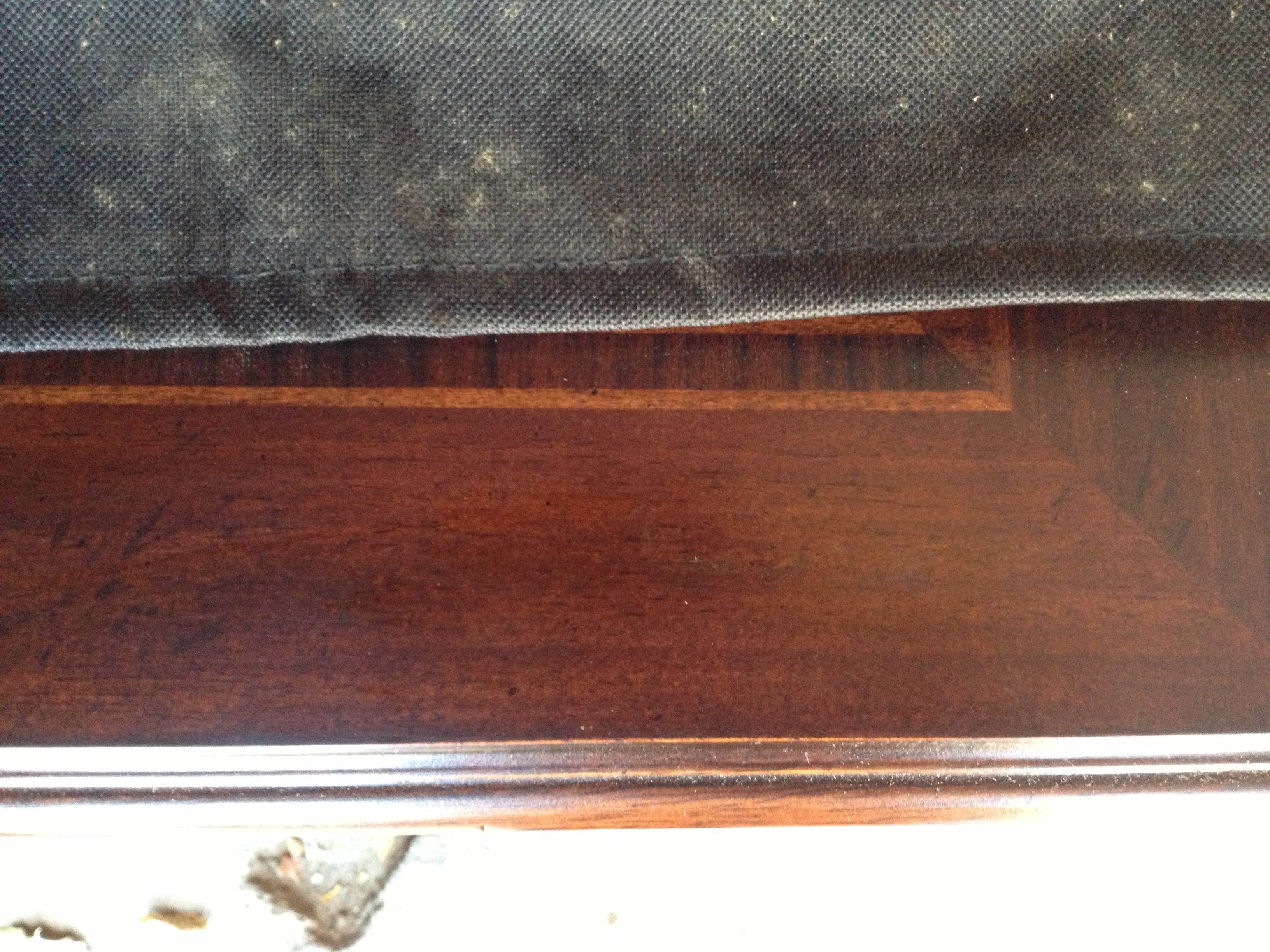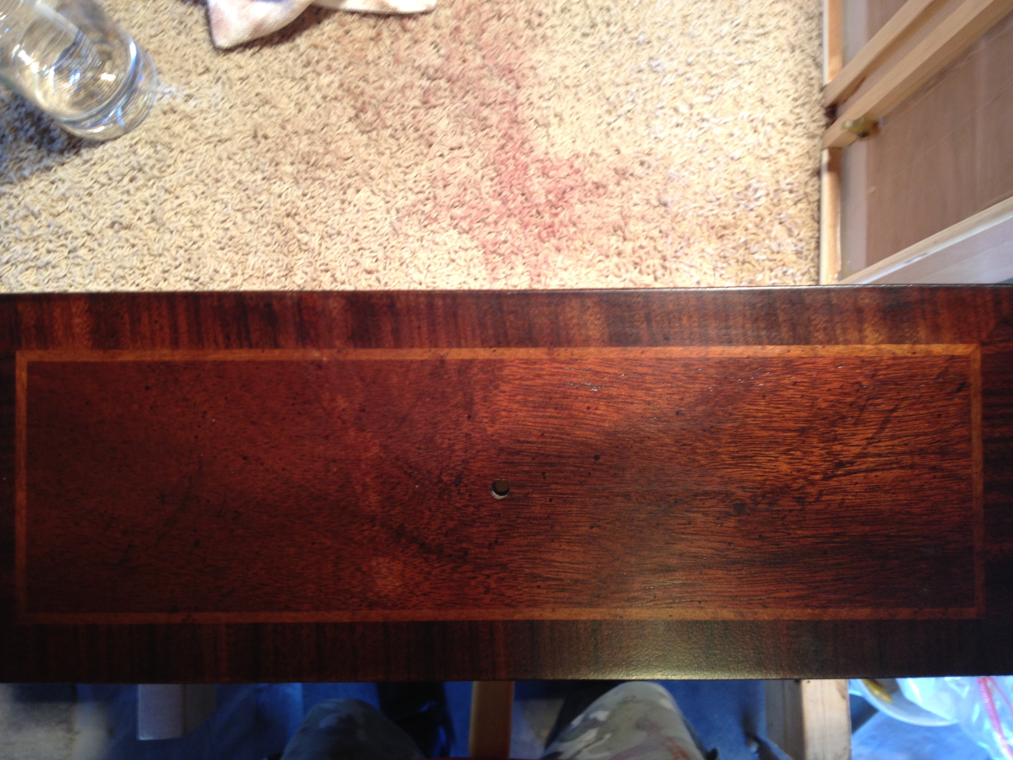The second piece of damaged furniture was a 3 drawer side-table (part of a 7 piece living room set). Our customer had spilled hot-pink nail polish onto the top of the end table and also down the front of the 3 drawers. After spilling the nail polish our customer tried to remove the polish with nail polish remover, which unfortunately caused further damage to the end table. The nail polish ate through the finish down to the bare wood so a precision repair was not possible. A full strip and refinish of both the table top and the 3 drawers was required. The Gloss factory cured finish of the table made the return of the color and the glossy finish particularly lengthy and difficult process to return the polished / deluxe finish.