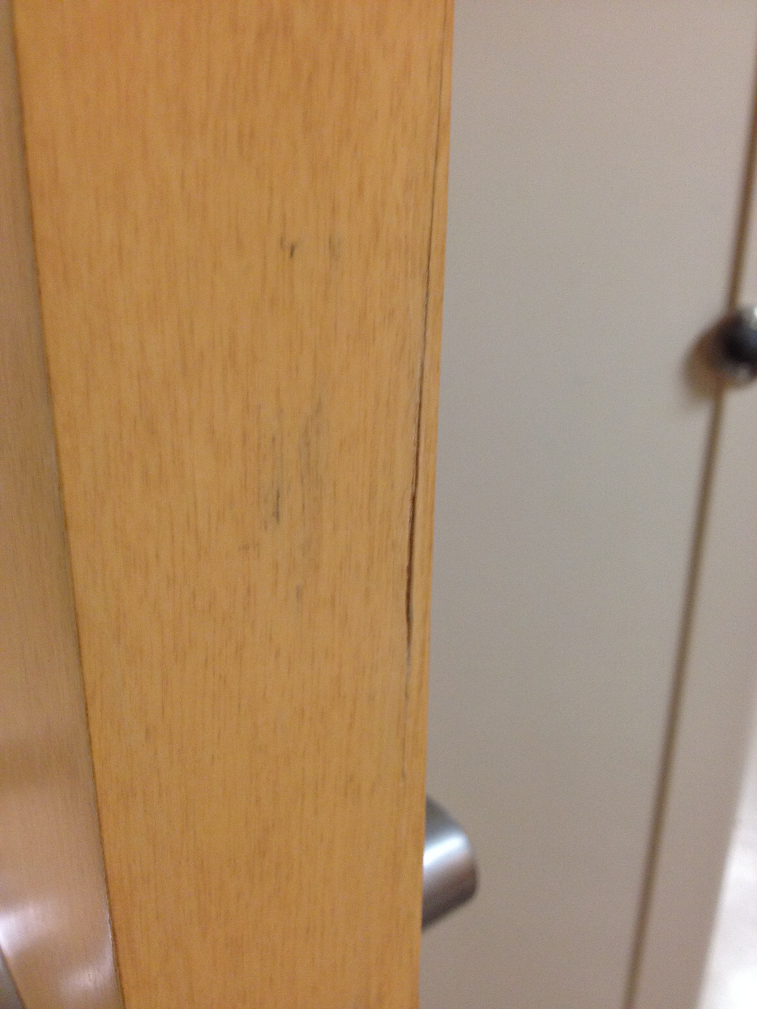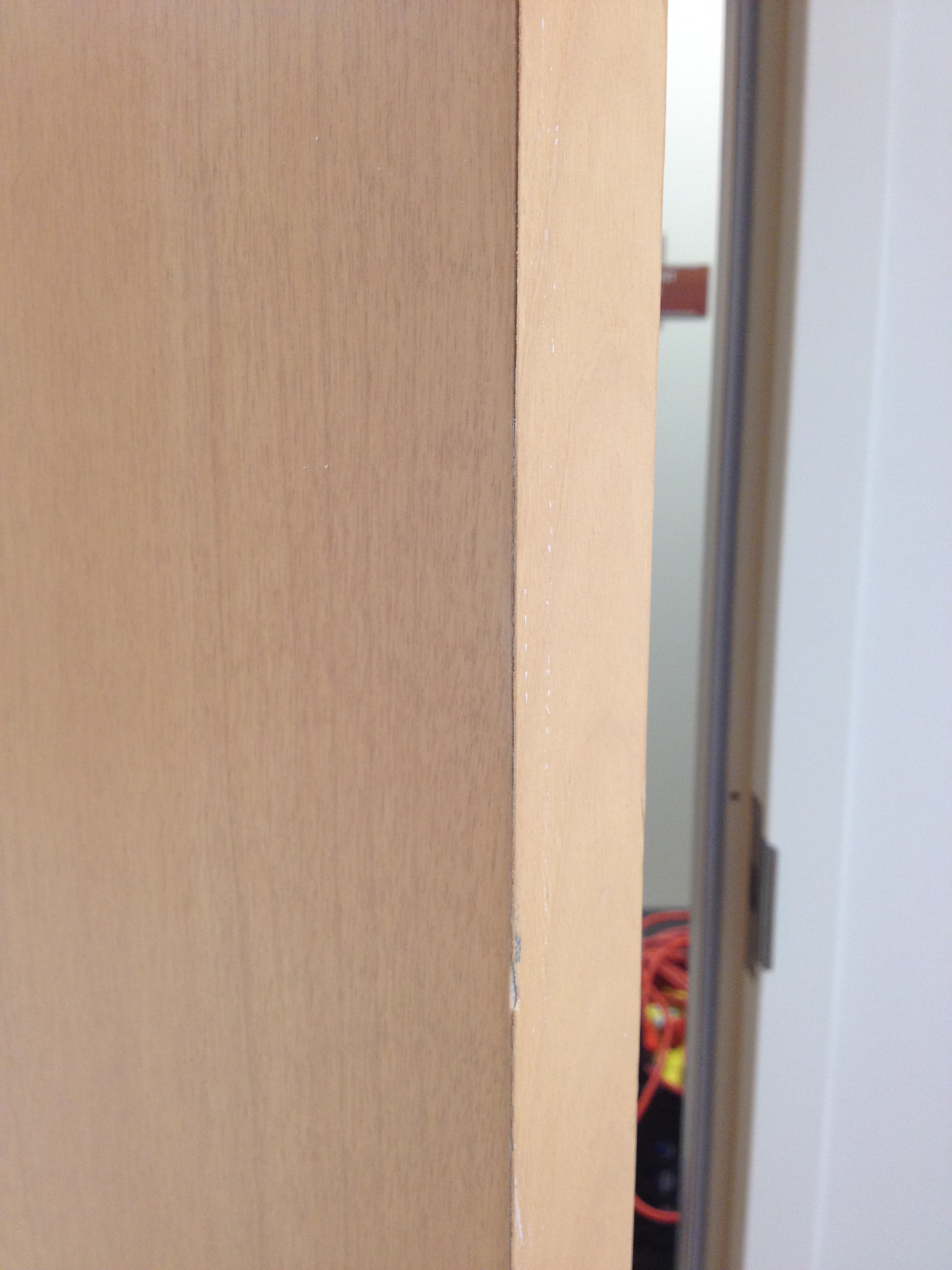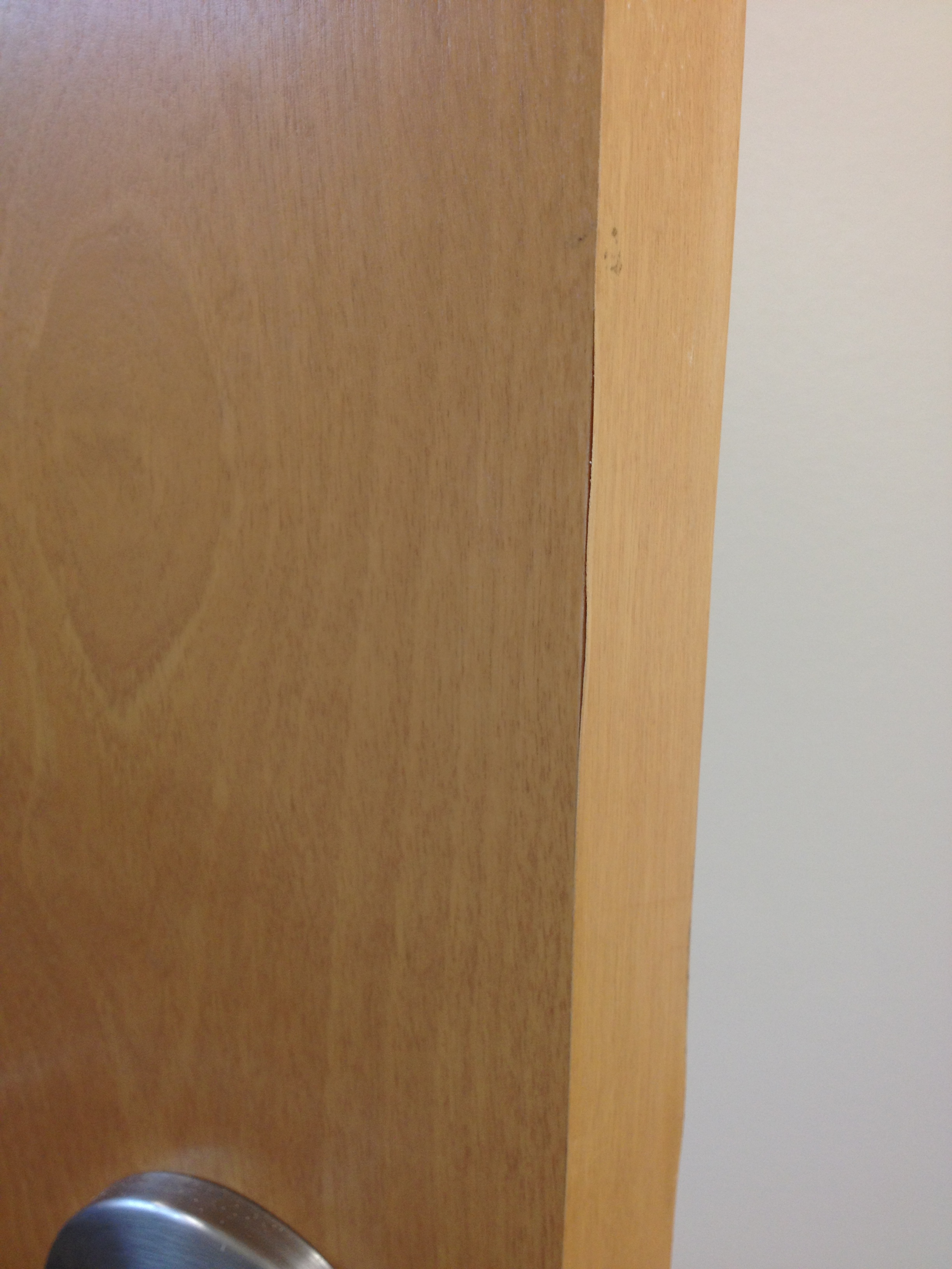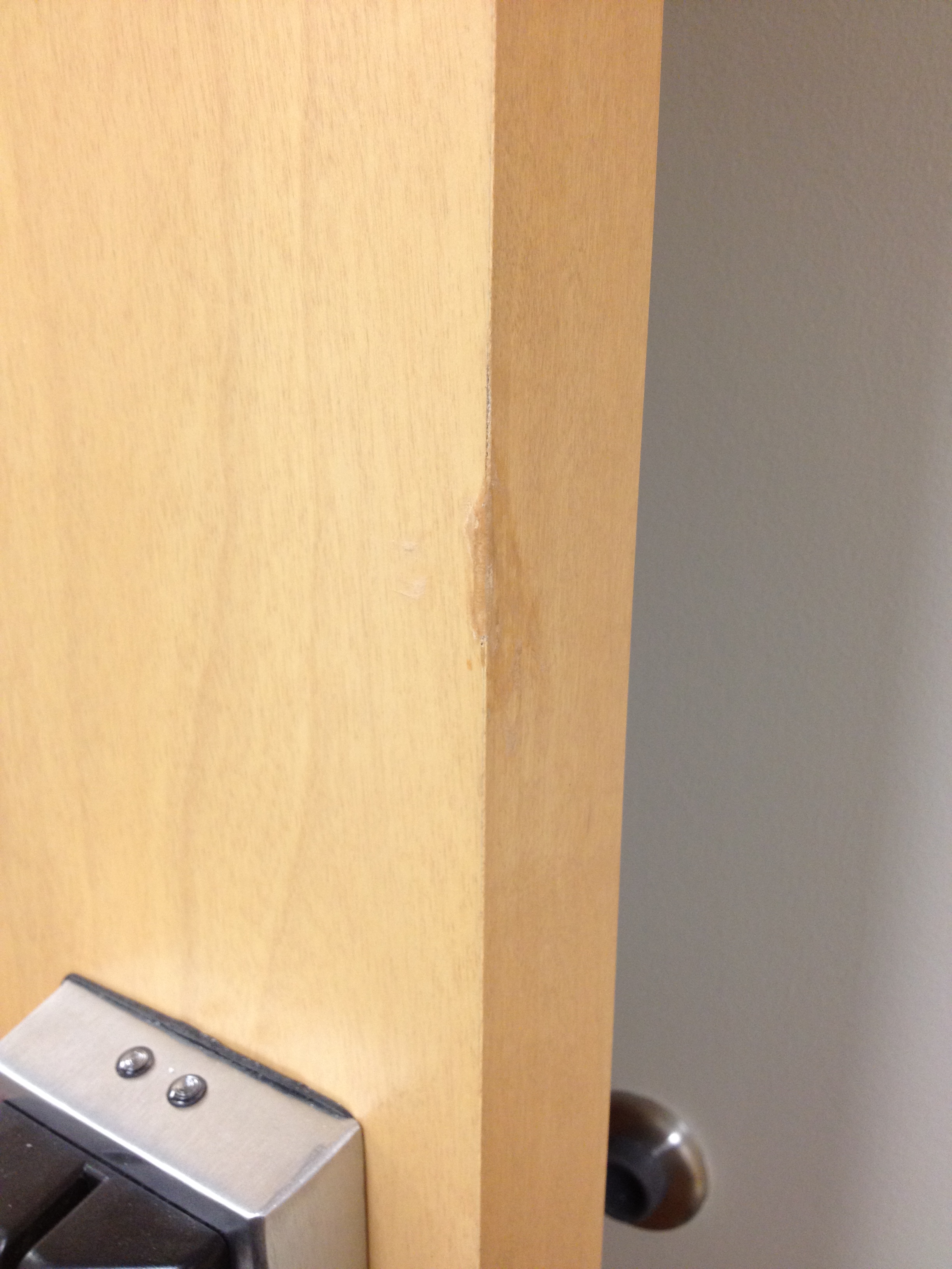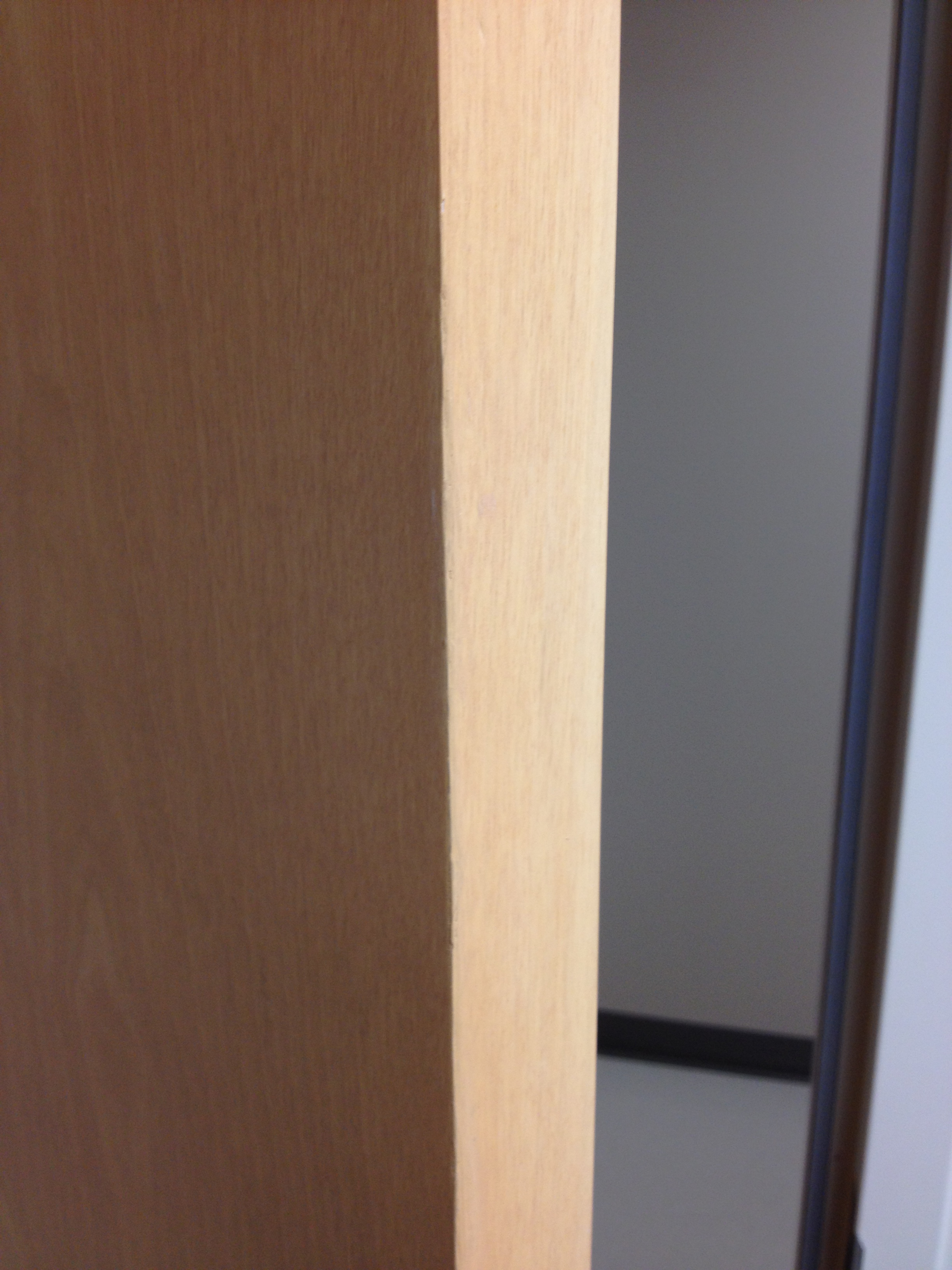 Mark Ryan of Furniture Medic recently was hired to oversee a large door veneer repair project. A large volume of doors were delivered to a new facility and installed that unfortunately turned out to have defects likely caused by shipping conditions and installation.