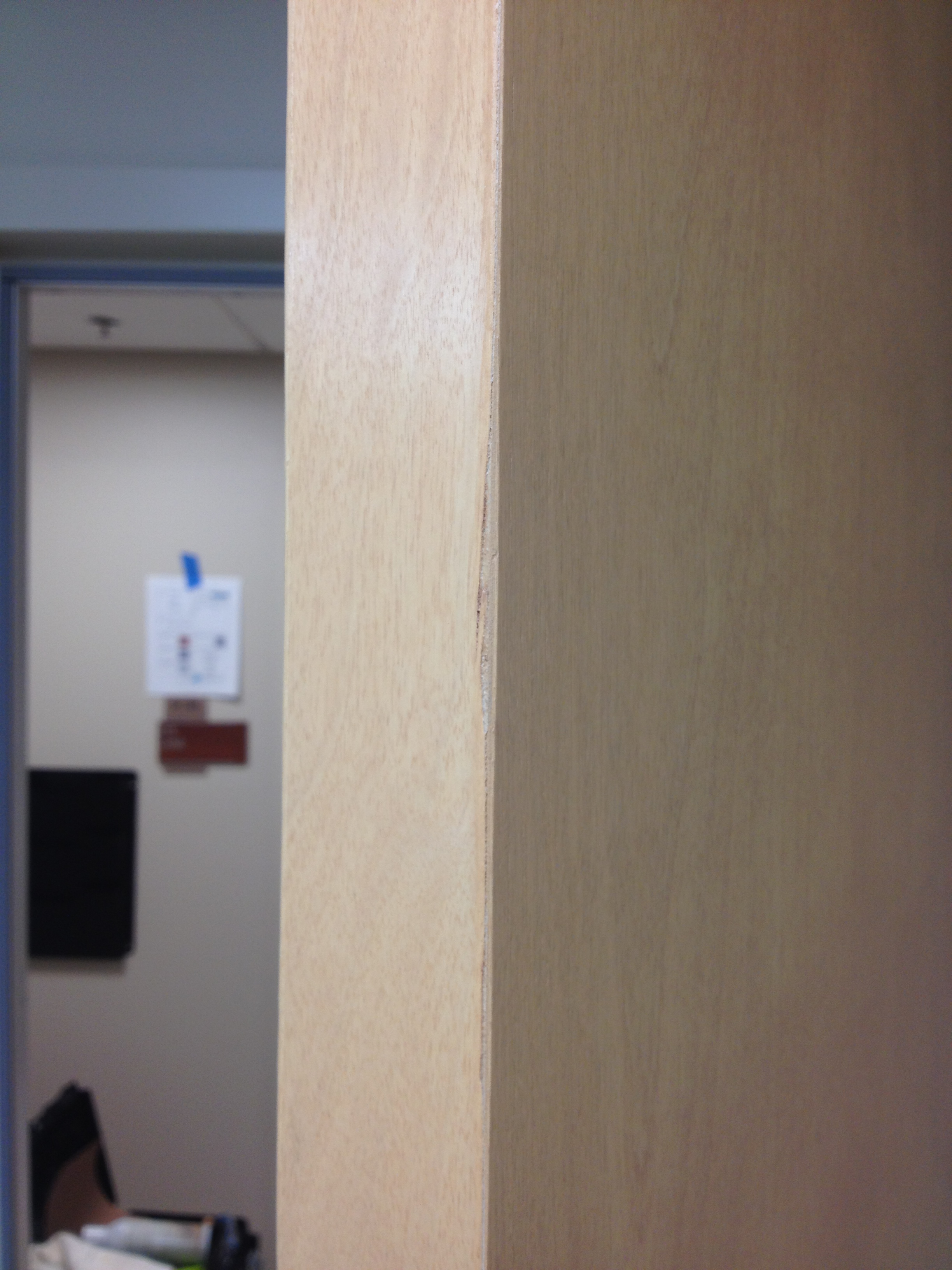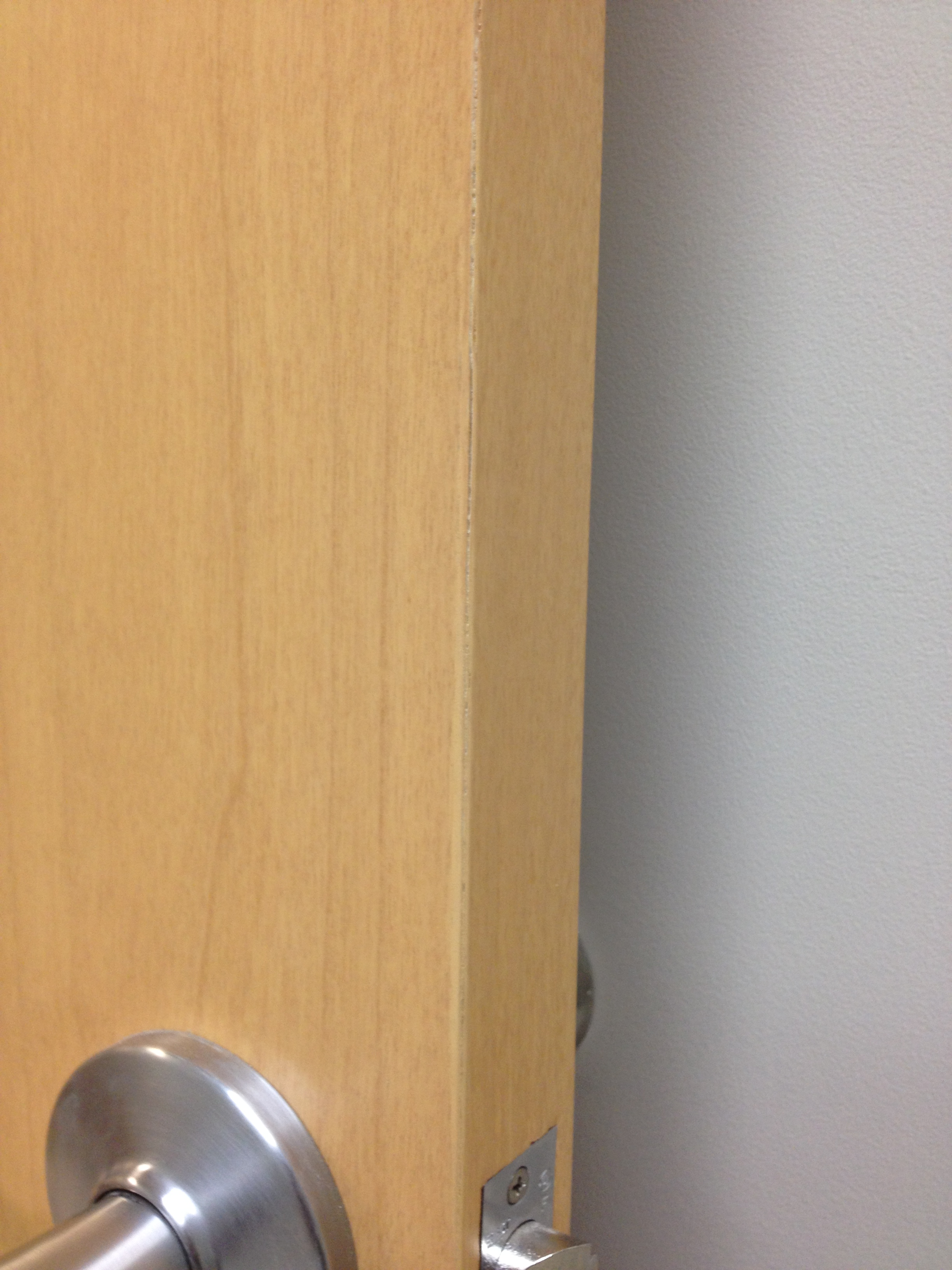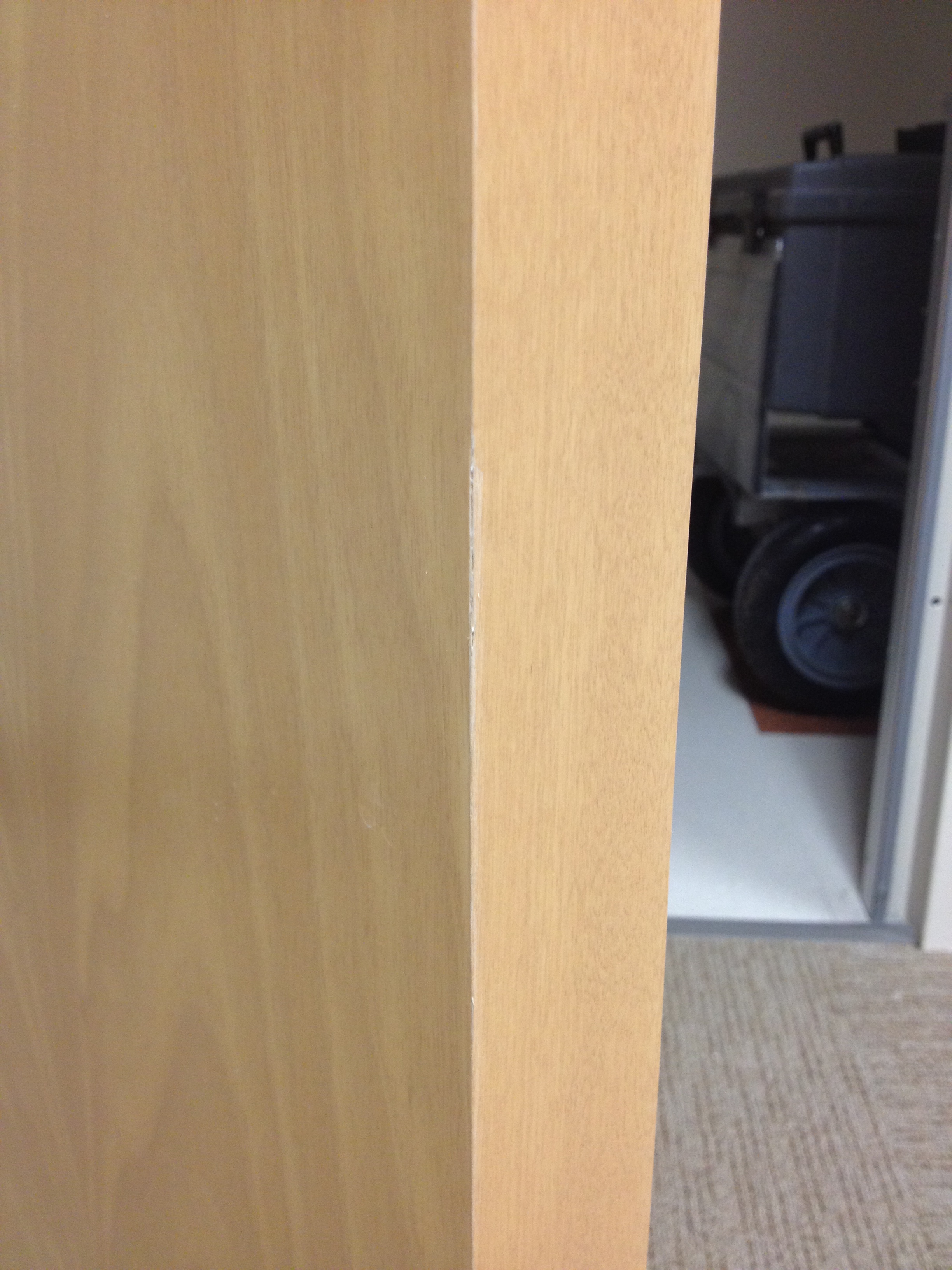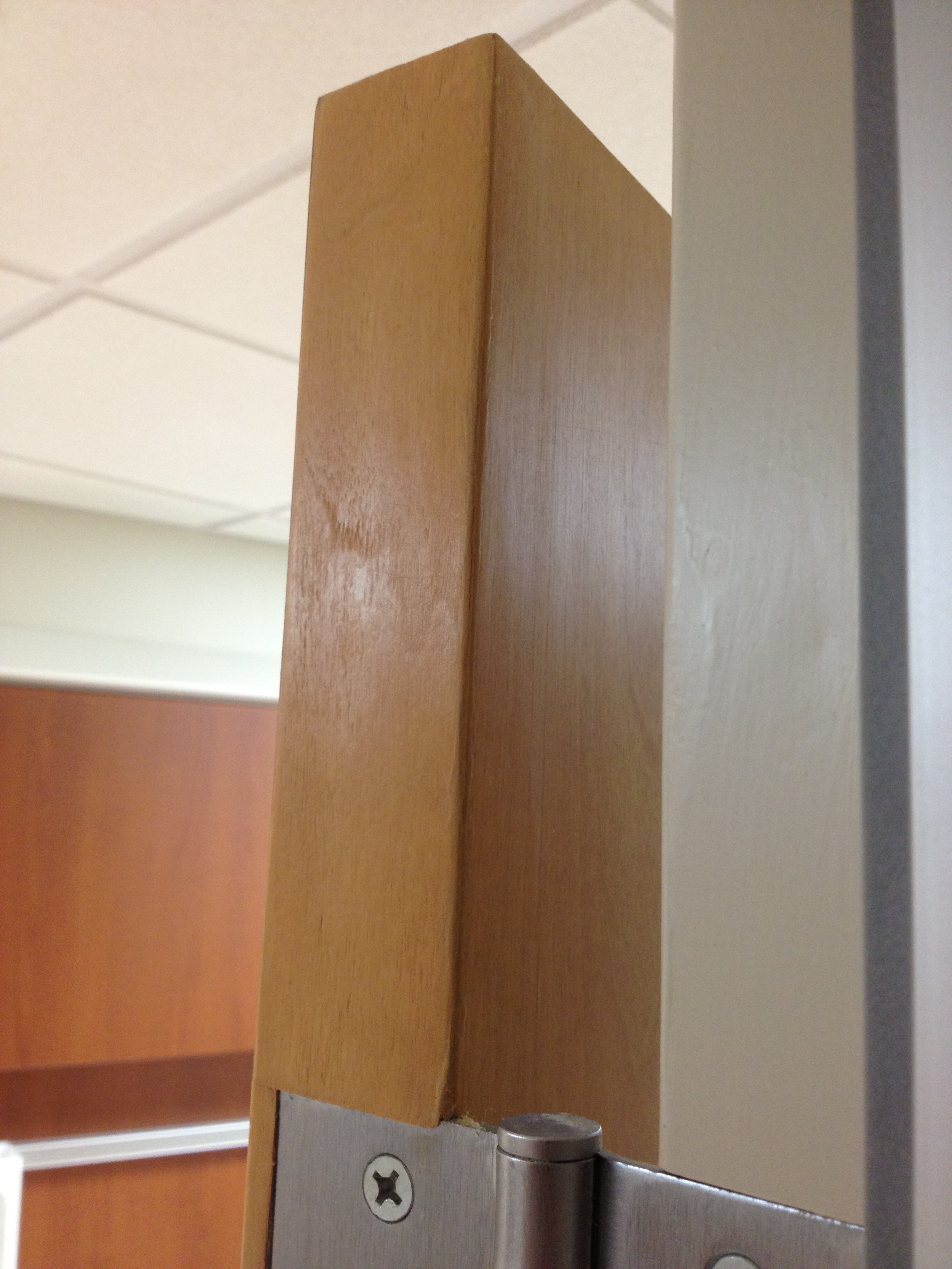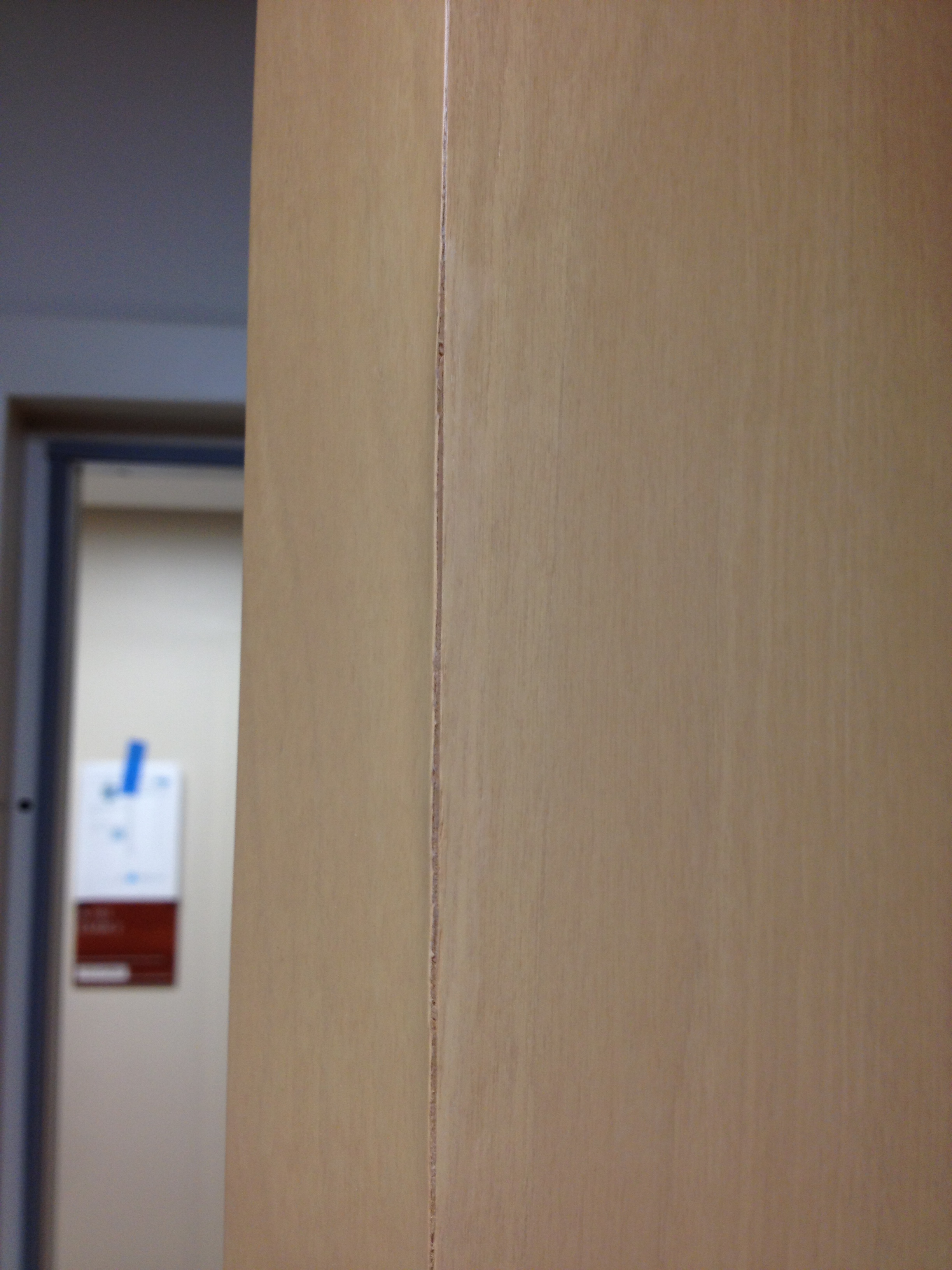 Mark Ryan of Furniture Medic recently was hired to oversee a large door veneer repair project. A large volume of doors were delivered to a new facility and installed that unfortunately turned out to have defects likely caused by shipping conditions and installation.