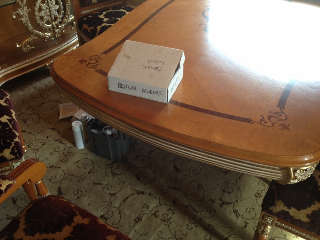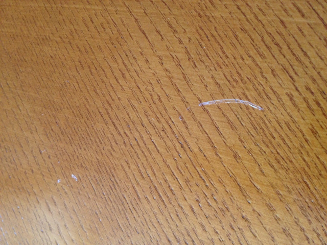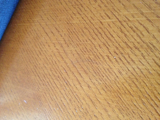 Mark repaired 2 large dents to the table edge; 2 scratches to the bottom foot plate of the table; removed packing glue from the glass of the matching armoire and finally repaired one the dining chairs that had where the cushion had been pushed away from the chair frame.