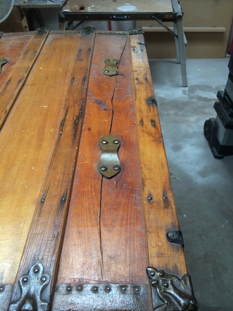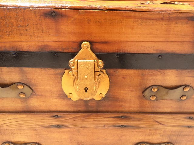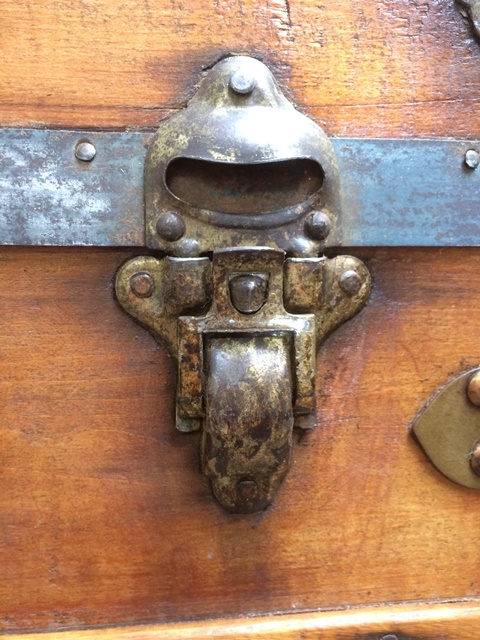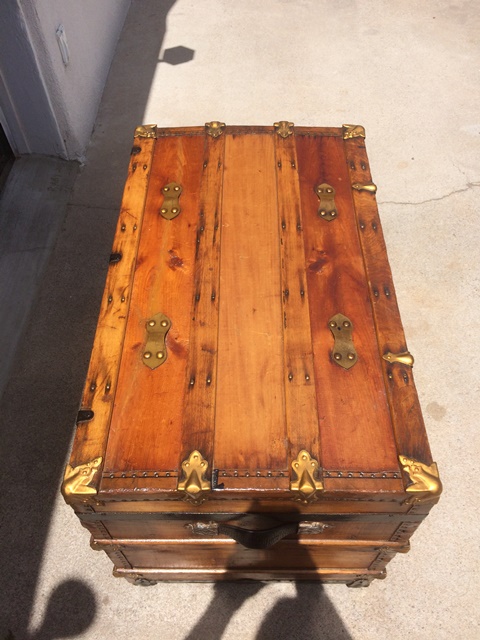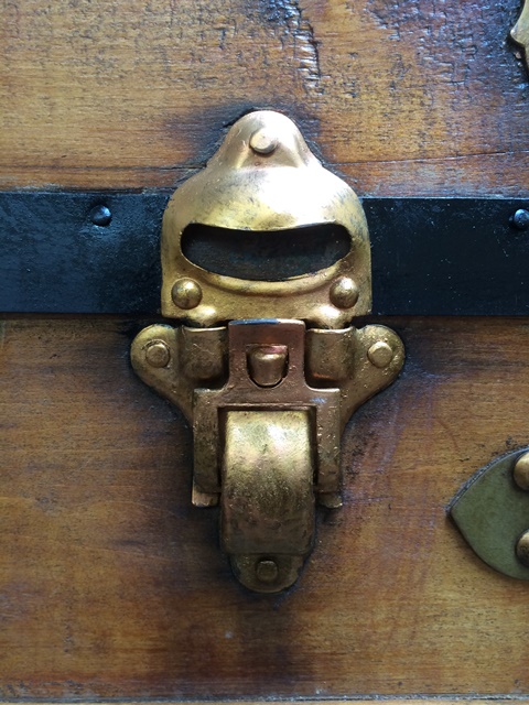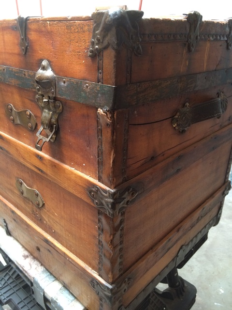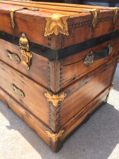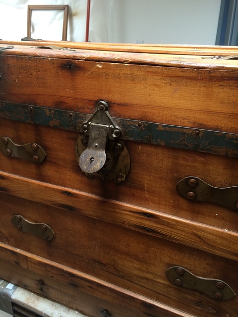Although our customer’s trunk was in relatively good condition the brief was to make it look pretty and glossy! There were precision repairs using epoxy putty fill techniques to the corner edges and a large crack to the top. The metal corner and edge protectors needed the old finish removed; we then added an Antique gold bronzing powder to give it the pretty pop that the customer wanted.